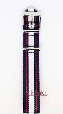 - Pasuje do zegarków z mocowaniem 20mm. Wykonany z materiału w stylu Nato. Stalowa błyszcząca sprzączka w kolorze srebrnym.
